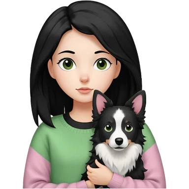 girl with side parted long black hair, wearing a light pink and green sweater, carrying a black and white border collie with perked ears emoji