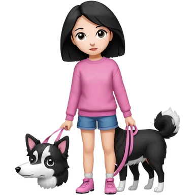 full body girl with side parted black hair shoulder length black eyes wearing pink sweater carrying black and white border collie with perked ears emoji style emoji