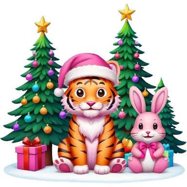Smiling Pink tiger with Santa hat sitting with a bunny as friends and brightly lit colorful Christmas trees 🎁 emoji