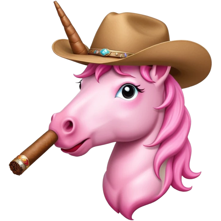 pink unicorn wearing a cowboy hat with a cigar in its mouth emoji | AI Emoji Generator