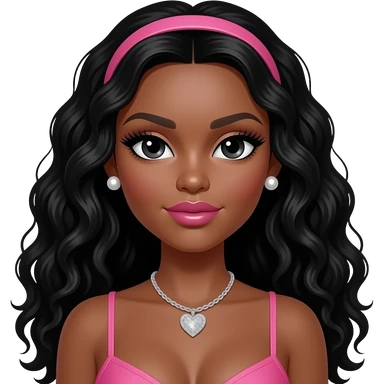 Pink bimbo lips, black doll eyes, dark brown skin, Long giant lashes,Doll faced shaped, silver Swarovski heart necklace, big Pearl earrings studs, bimbo, black doll eyes, barbie, darker brown skin with long curly black hair,, big breast no bra emoji