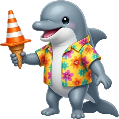 dolphine with an ice cream cone but make it the cone a traffic cone and give him a hawaiian shirt and put pink stars around him emoji