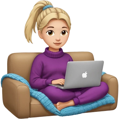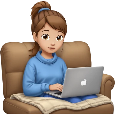 Cozy girl with ponytail on a cozy sofa with laptop on knees and a warm blanket, relaxed online shopping from home emoji