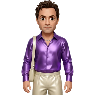Mark Ruffalo with brown eyes, dark brown hair, purple metallic shirt, cream metallic baggy pants, silver necklace emoji