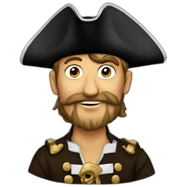 A 3D cartoon pirate with one eye covered by a black eye patch, holding a treasure chest of gold, wearing a hat, standing on sand, Memoji-style. emoji