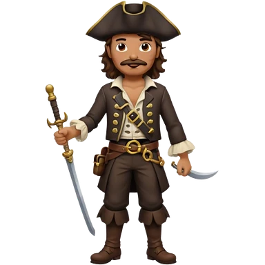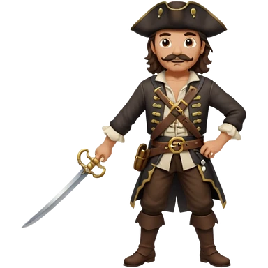 Pirate full body with dark brown wavy hair and mustache and sword emoji