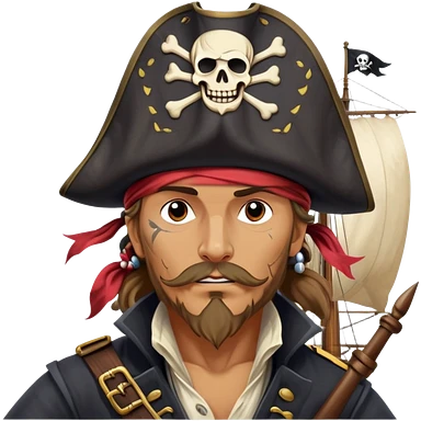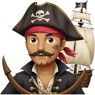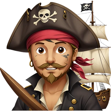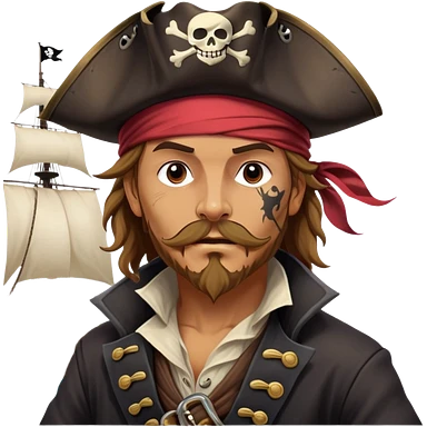 clash-of-clans-aesthetic_-cinematic-focused-pirate-bust-portrait-emoji, head slightly tilted with a determined, roguish expression and bold features, featuring a compact, spirited build with a jaunty hat and quirky bandana on tan skin, at the helm of a grand sailing ship complete with billowing sails and a tattered Jolly Roger flag fluttering dynamically in a tempestuous sea breeze. emoji