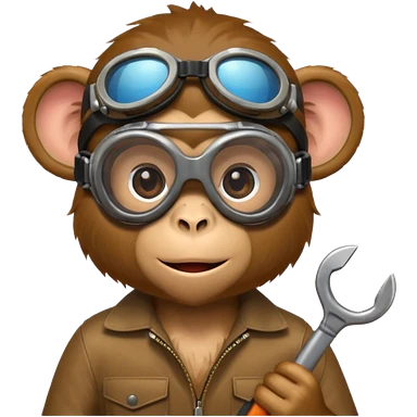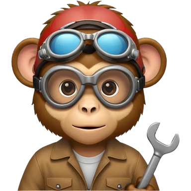 Curious monkey with goggles, holding a wrench or small gadget. emoji