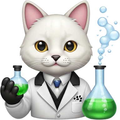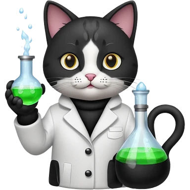 Sleek cat wearing a white coat, paw on a bubbling flask. emoji