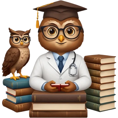 Wise owl with glasses, wearing a lab coat, perched on a stack of books. emoji