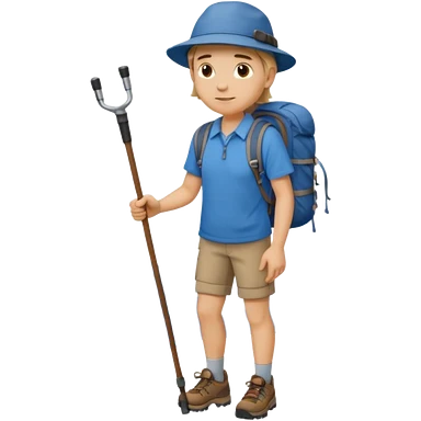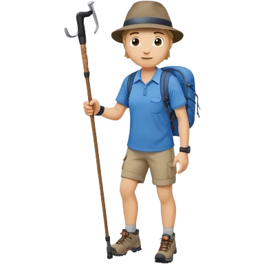 a full-body hiker with a hat blue shirt and hiking stick.hiking a mountain emoji