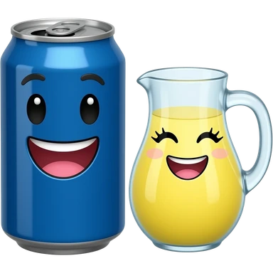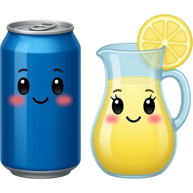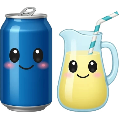 A plain blue soda can with a cute face without eyelashes and a pitcher of lemonade with a cute face with eyelashes emoji