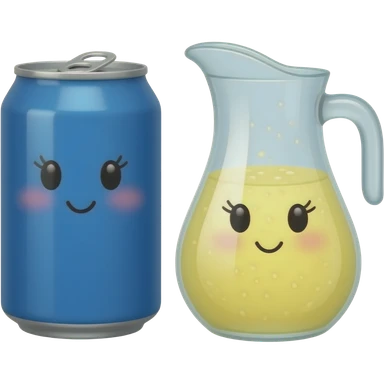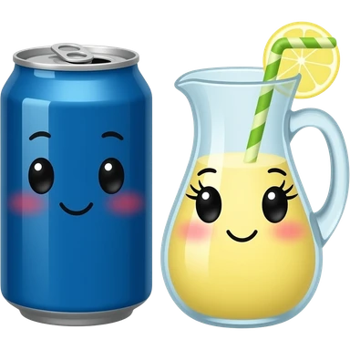 A plain blue soda can with a cute face without eyelashes and a wide pitcher of lemonade with a cute face with eyelashes emoji