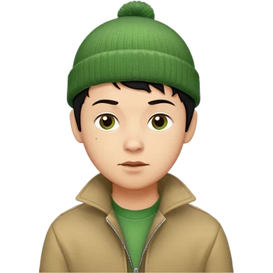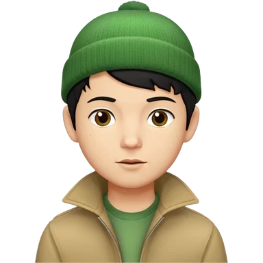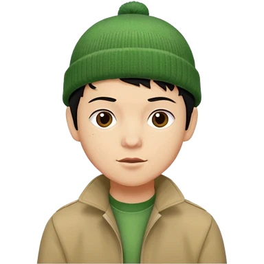 young man with pixie cut black hair, green beenie hat, tan jacket and pork chop sideburns emoji