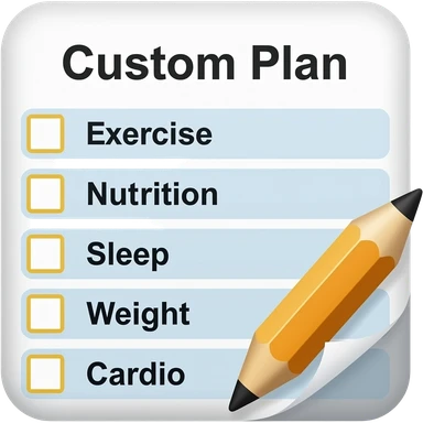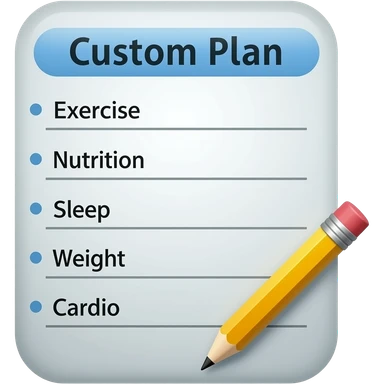 Un programme d'entraînement en salle de sport, avec un crayon dans le coin et intitulé « Plan personnalisé », doit clairement indiquer ce qui suit : Exercice, Alimentation, Sommeil, Poids, Cardio. emoji