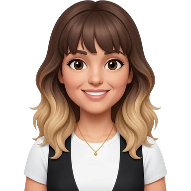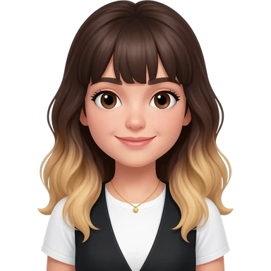 An adult girl with an oval-shaped face and feminine features, long dark brown wavy hair fading to blonde at the ends with light bangs. Thick dark eyebrows, large expressive eyes, and a warm smile. She is wearing a white T-shirt with a black vest and a delicate golden necklace. emoji