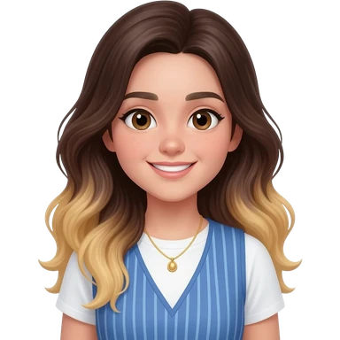 An adult girl with an oval-shaped face and feminine features, long dark brown wavy hair fading to blonde at the ends with light bangs. Thick dark eyebrows, large expressive eyes, and a warm smile. She is wearing a white T-shirt with a blue striped vest and a delicate golden necklace. emoji