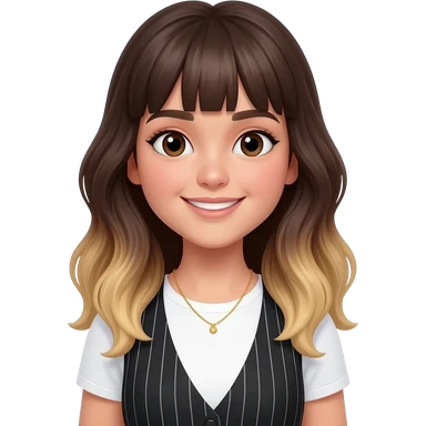 An adult girl with an oval-shaped face and feminine features, long dark brown wavy hair fading to blonde at the ends with light bangs. Thick dark eyebrows, large expressive eyes, and a warm smile. She is wearing a white T-shirt with a black striped vest and a delicate golden necklace. emoji