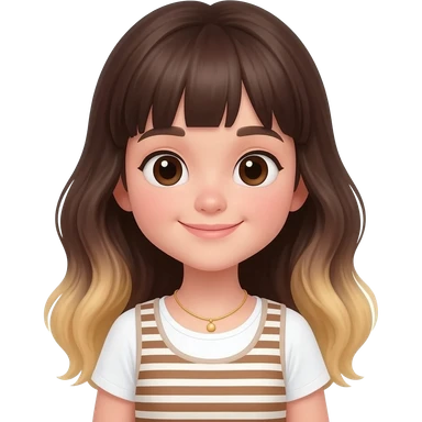 A young girl with an oval-shaped face and feminine features, long dark brown wavy hair fading to blonde at the ends with light bangs. Thick dark eyebrows, large expressive eyes, and a warm smile. She is wearing a white T-shirt with a striped vest and a delicate golden necklace. emoji