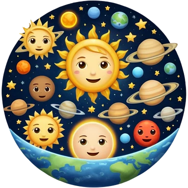 landscape image of the sun as a king, surrounded by the moon, Mercury, Venus, Earth, Mars, Jupiter, Saturn, Uranus, and Neptune, all floating in space, each planet with a cute expressive face, in emoji style emoji