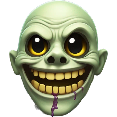 Create an image of a beaming zombie with a wide grin, holding a bright yellow smiley face emoji in its hands, surrounded by colorful flowers in a graveyard. emoji