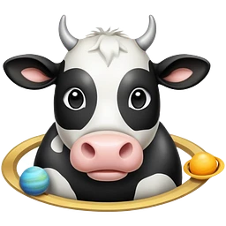 Cartoon cow face on one side of planet Saturn, with the planetary rings around the middle and tiny cow legs sticking out from the bottom emoji