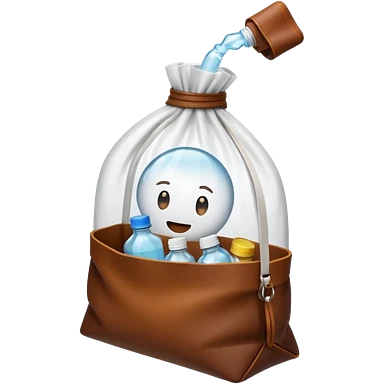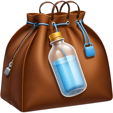 white transparent plastic bottles popping out of a leather brown bundle bag emoji