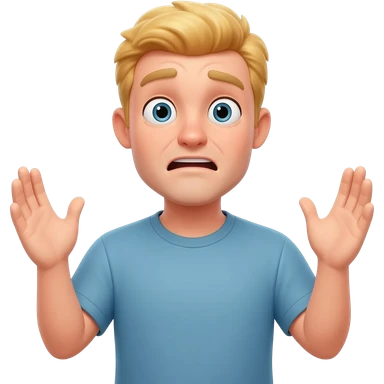 Homme blond cheveux courts qui lève les bras avec mains ouvertes pour dire qu’il a rien fait avec regard interloqué emoji