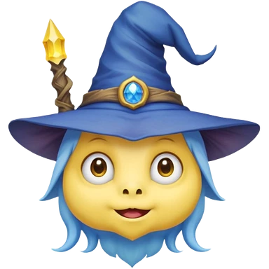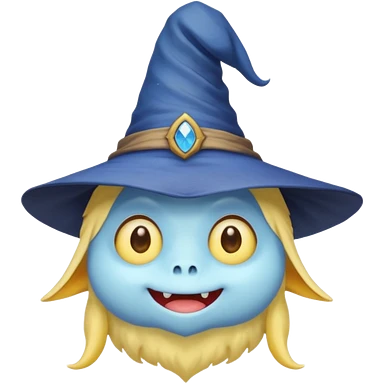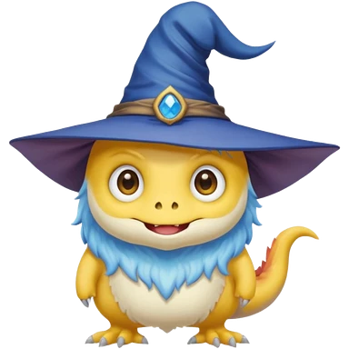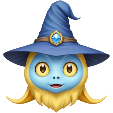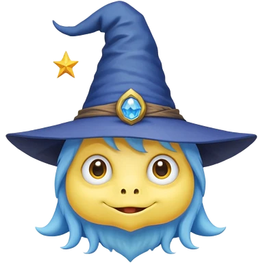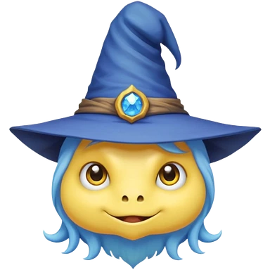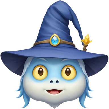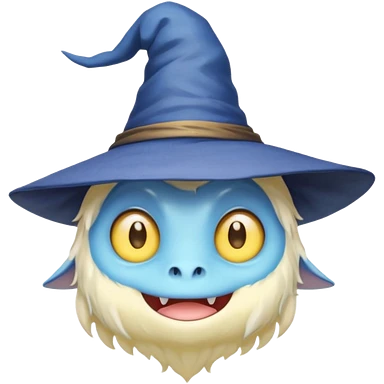 cute monster with white body, yellow tail, wearing blue sky witch hat. the face facing the front towards the 4th wall emoji