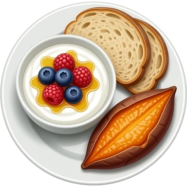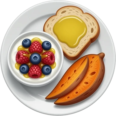 Realistic Plate with greek yogurt bowl topped with blueberries raspberries and maple syrup and sourdough slice topped with a lot of olive oil and a sweet potato on the side HD emoji