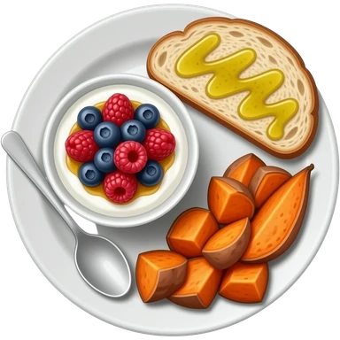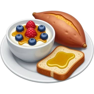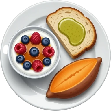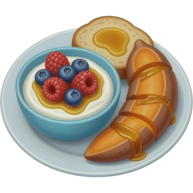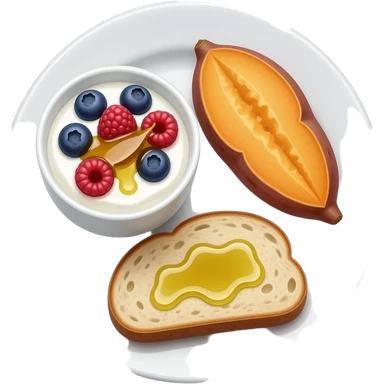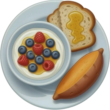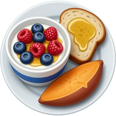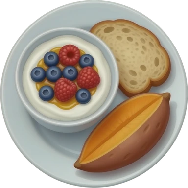 Plate with greek yogurt bowl topped with blueberries raspberries and maple syrup and sourdough slice topped with olive oil and sweet potato emoji | AI Emoji Generator