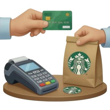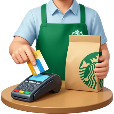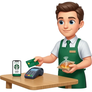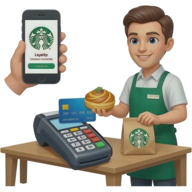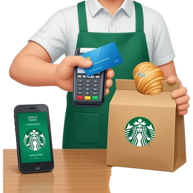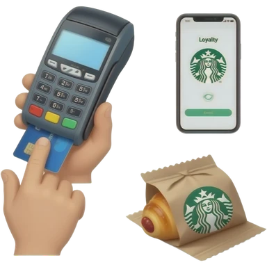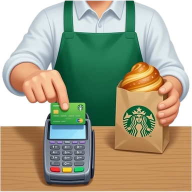 Please show hands of customer left hand they should be paying with their card on POS SYSTEM , have their phone on the table with the starbucks loyalty point and the cahsier should be handing them a pastry emoji
