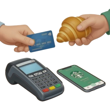 Please show hands of customer left hand they should be paying with their card on POS SYSTEM , have their phone on the table with the starbucks loyalty point and the cahsier should be handing them a pastry in a starbucks packaging emoji