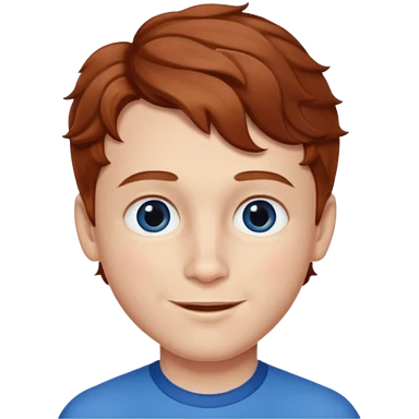 Please generate a portrait of a boy. He has light brown to reddish-brown wavy hair, a right side parting, longer sideburns, blue eyes, a snub nose, and a somewhat pronounced, strawberry-red pout. He is smiling. emoji