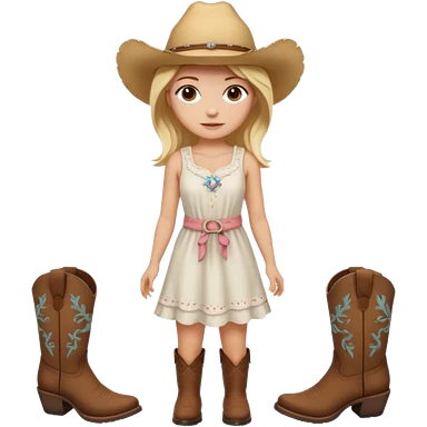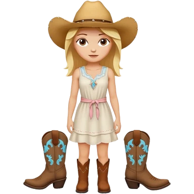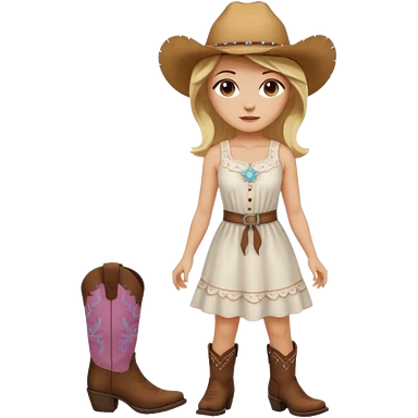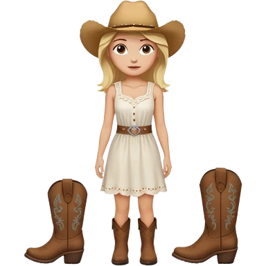 Please give me the woman standing emoji with a peach skin tone, medium length blonde hair, and dark brown eyes. Please make her wear a white sundress and brown cowgirl boots emoji
