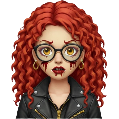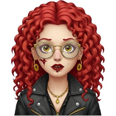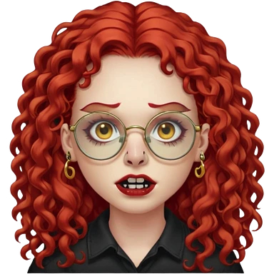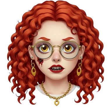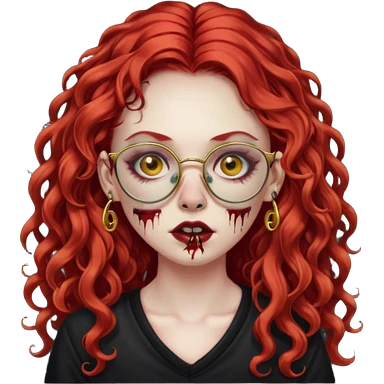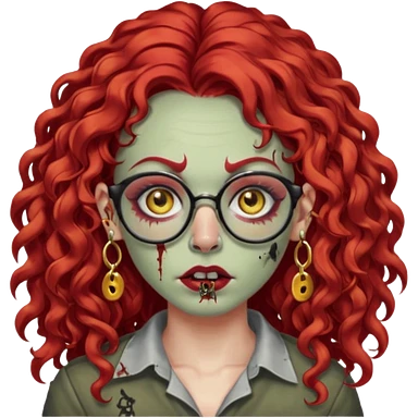 zombie girl with long red curly hair, thick lashes, black glasses, gold nose piercings on each nostril, and a gold eyebrow piercing. emoji