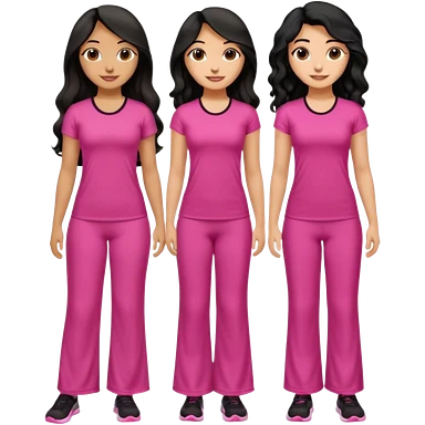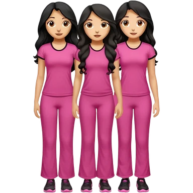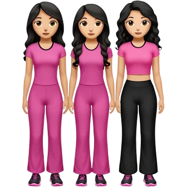 3 olive skin tone best friends. First one wearing pink gym attire modest with long black hair wavy. Second one wearing a pink fitted long maxi dress with curves long black hair and the last one wearing pink casual clothes with brown mid length hair similing looking glammed up emoji