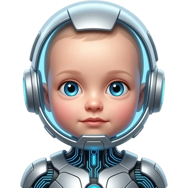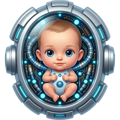 This image is a piece of digital art depicting a futuristic fetus or cyborg infant encased in technology. The subject appears to be integrated with electronic circuitry, resembling a human-machine hybrid. emoji