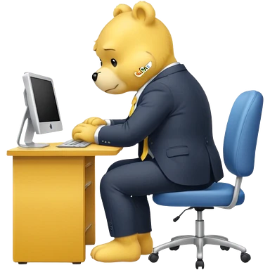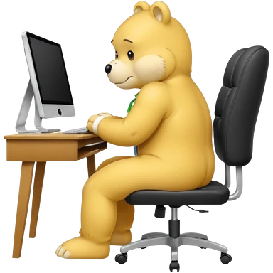 Yellow Care bear sad in suit back view, sit on a chair, working on a computer, with a big desk emoji