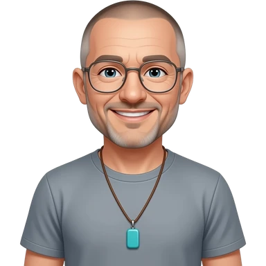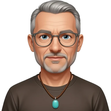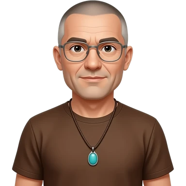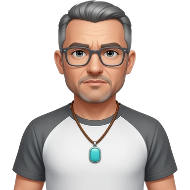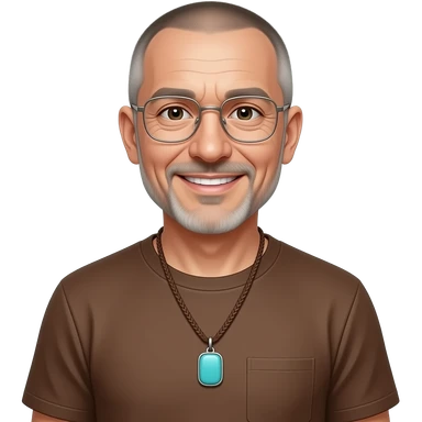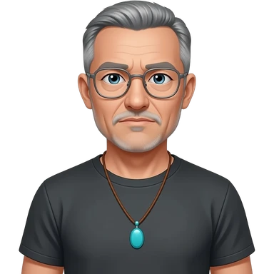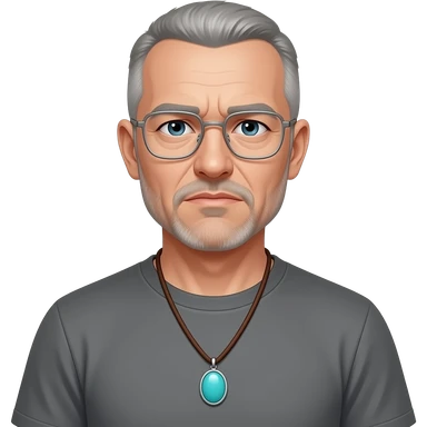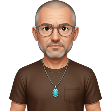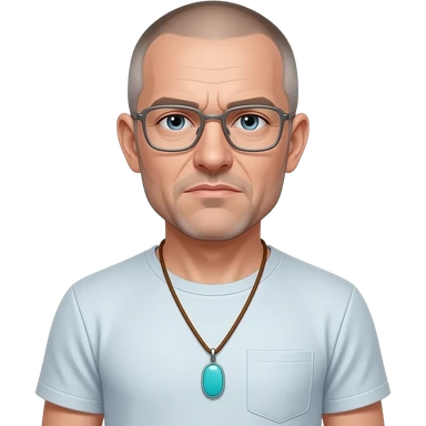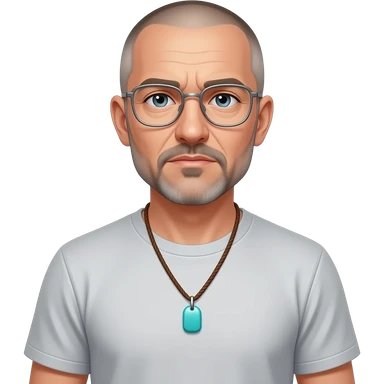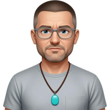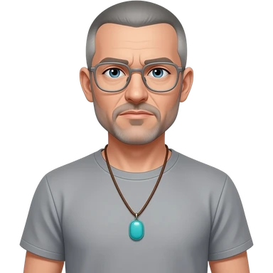 pointed chin pointed chin haved face pendant without a clasp Turquoise on brown paracord t shirt shaved grey short hair full-length photo of extreme streetwear clean-shaven face cool boy thin metal-framed glasses very entellectual man, 52 years old street wear stubble, shaved short with clippers emoji | AI Emoji Generator