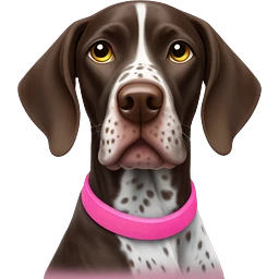 Brown and white German short haired pointer with pink bow on right ear emoji