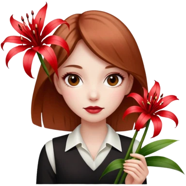 Create emoji a girl with light brown hair pale skin black eyes having poker face holding a red spider lily flowef emoji