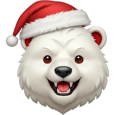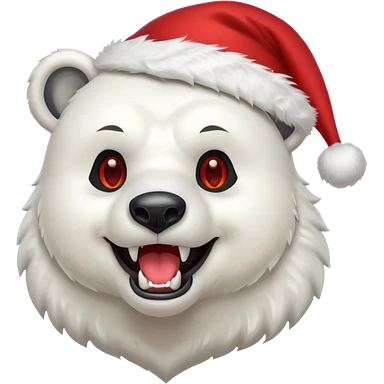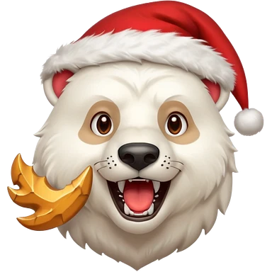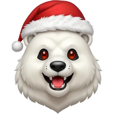 Polar bear and wolf hybrid with sabertooth fangs; smiling; wearing a Santa hat emoji