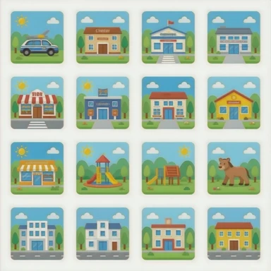 Police station, fire station, airport, restaurant, supermarket, library, cinema, toy shop, playground, zoo, museum, office, hospital, and school emoji