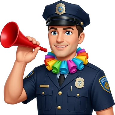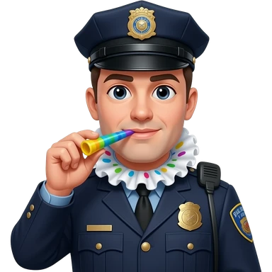 police with party ruffle on his neck and a party blower emoji