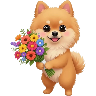 Pomeranian puppy holding flowers emoji