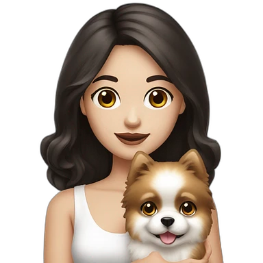 girl with dark hair and blue eyes with pomeranian dog in hands emoji