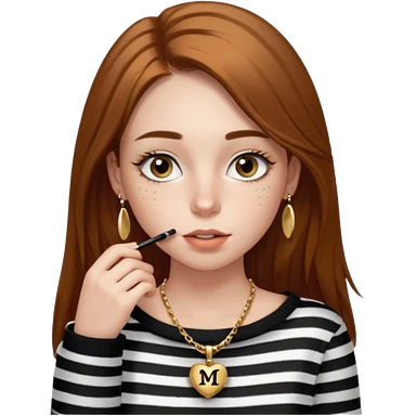 Chica guapa con pecas debajo del labio, pestañas largas con rímel, cejas finas y peludas, pelo marrón medio largo, piercing en la nariz, collar dorado con una "M" y jersey negro de rayas blancas con un hombro descubierto. emoji