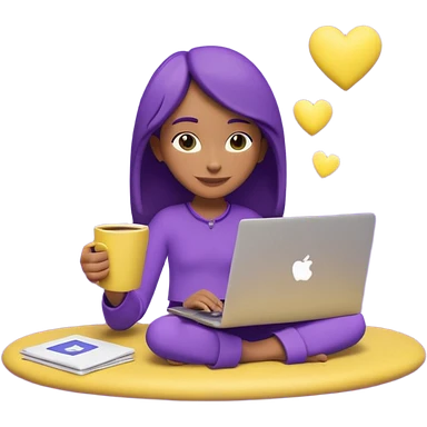 3D clay character relaxed with laptop and coffee, floating icons (envelope, heart, dollar), purple (#8B5CF6) outfit, bright yellow (#FBBF24) icons, white laptop, Pixar style, transparent background emoji