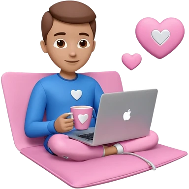 3D clay character relaxed with laptop and coffee, floating icons (envelope, heart, dollar), electric blue (#4A90D9) outfit, pink (#FF6B9D) floating icons, white laptop, Pixar style, transparent background emoji